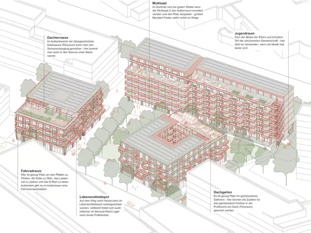 Die fünf eingereichten Entwürfe haben sich allesamt in einer beachtlichen Tiefe auf die Aufgabenstellung eingelassen. Tolle Ideen für viel Gemeinschaft und Begegnung geliefert. Auch die Grundrissbeispiele waren durchdacht und wie gefordert weitgehend flächensuffizient. Doch wie sich gezeigt hat, lag gerade in der Entwicklung unterschiedlicher Wohnungstypologien für die geforderten 400 Bewohnenden die größte Herausforderung. Fast alle Büros haben diese Zahl unterschritten – teilweise deutlich. Und gut begründet, wie die Jury einräumte. Das wäre einfach zu dicht geworden und damit eindeutig auf Kosten der Wohnqualität gegangen.